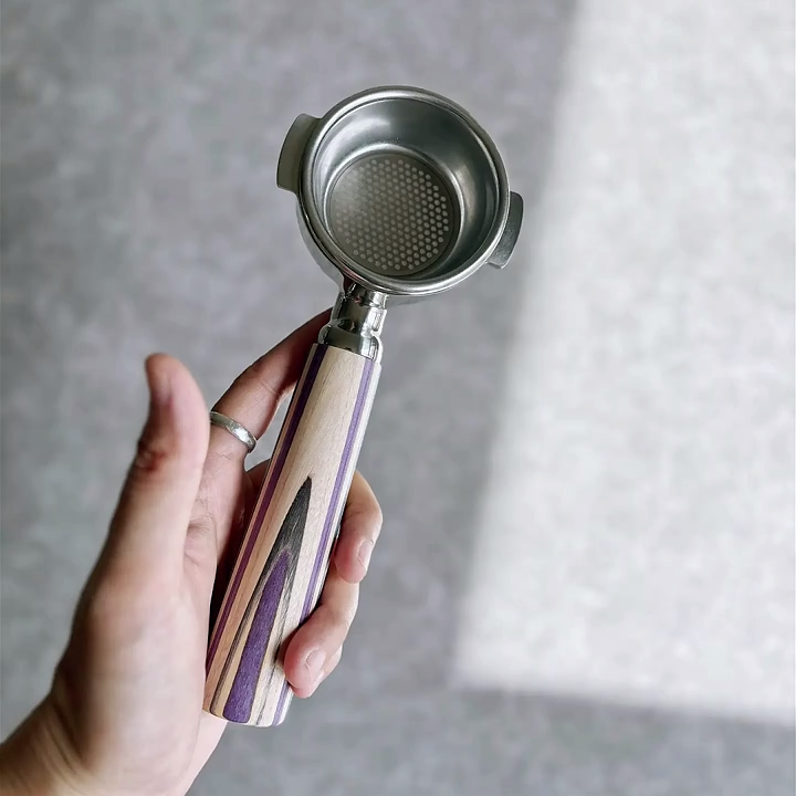 TimberFlare crafts 1-of-1 aftermarket artisan bottomless portafilters for Breville machines, featuring a stunning Amethyst Stripe handle and a 304 stainless steel head.