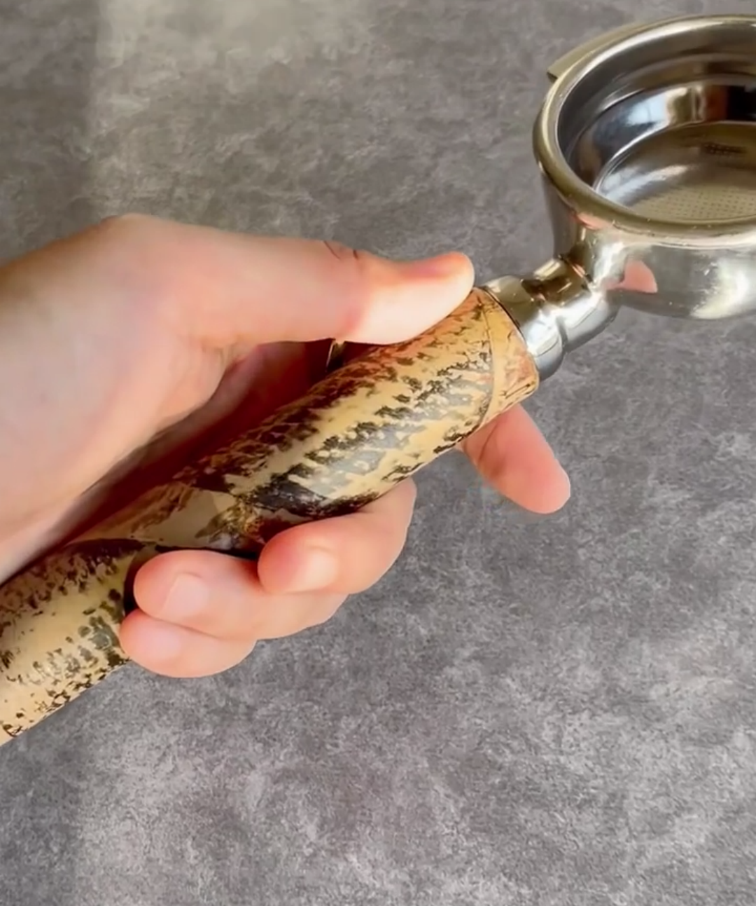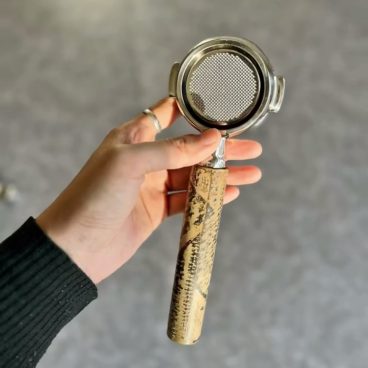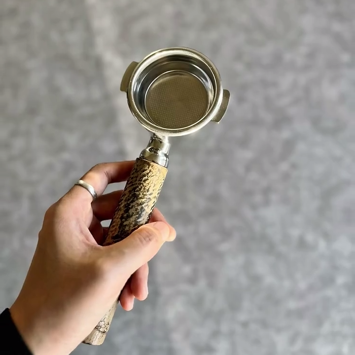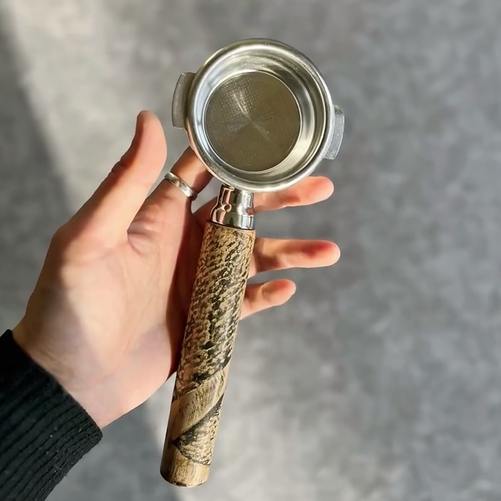 TimberFlare creates 1-of-1 aftermarket artisan bottomless portafilters for Breville machines, featuring a stunning textured exotic wood handle and a 304 stainless steel head.