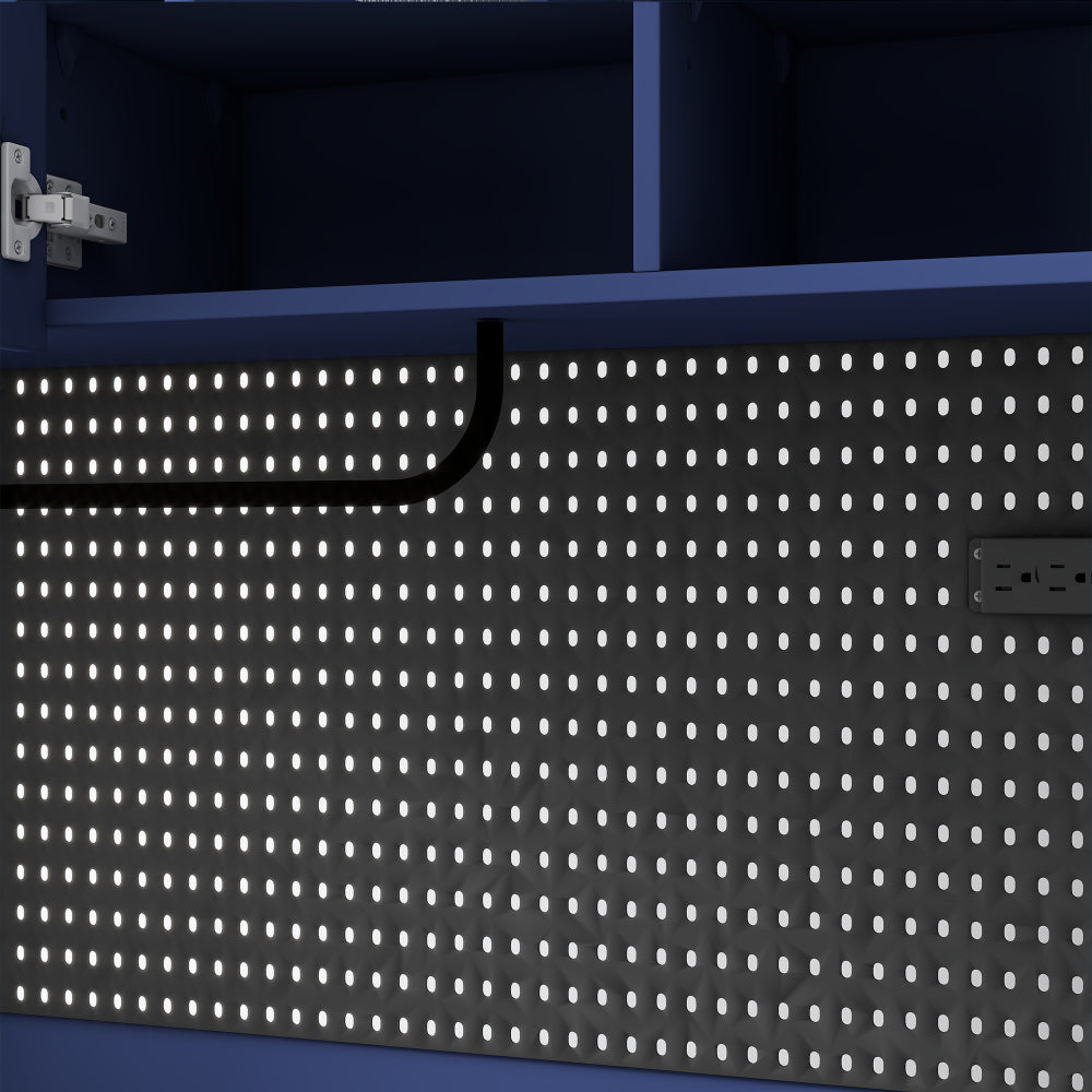 The pegboard is a durable, finished MDF panel integrated into the hutch's backsplash. It is designed to accommodate standard 1/4-inch pegboard hooks, allowing you to easily customize your hanging storage for mugs and tools.