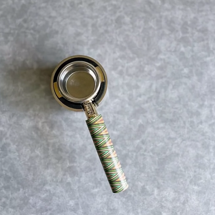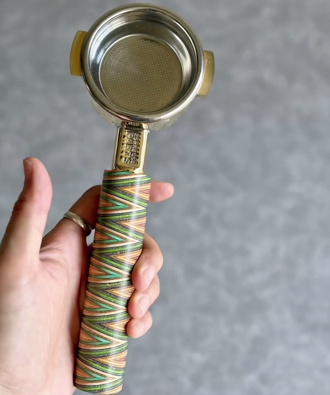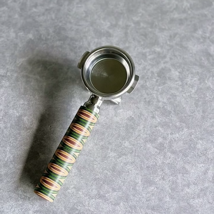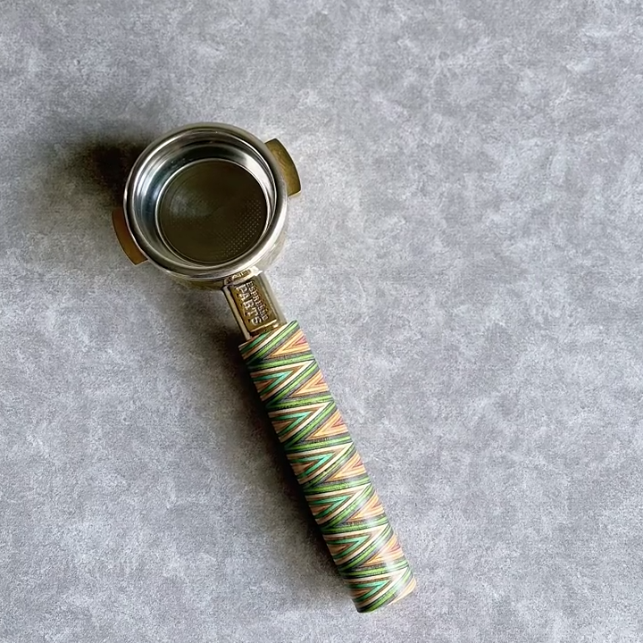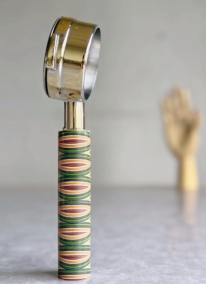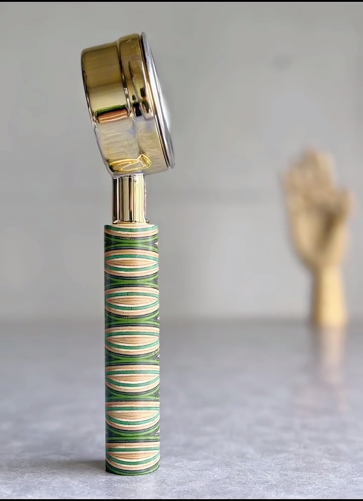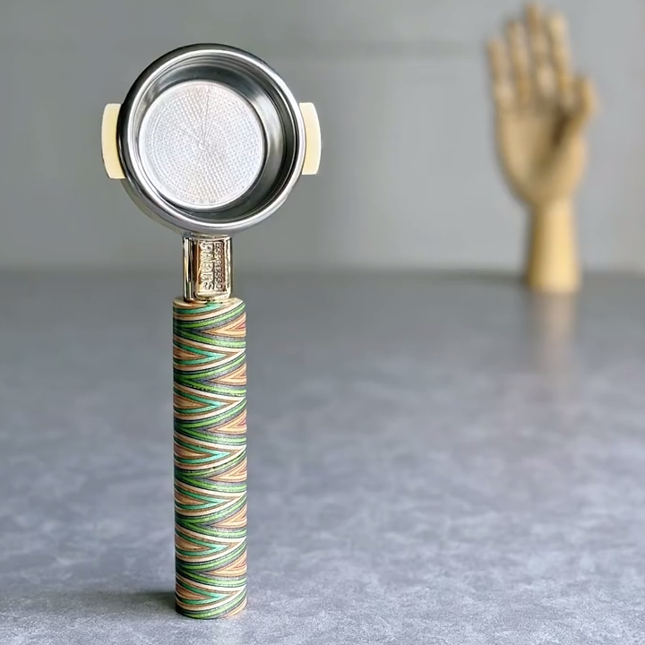 TimberFlare makes 1-of-1 aftermarket artisan bottomless portafilters for Breville machines, featuring a Chevron Prism layered wood handle and a gold-toned 304 stainless steel head.