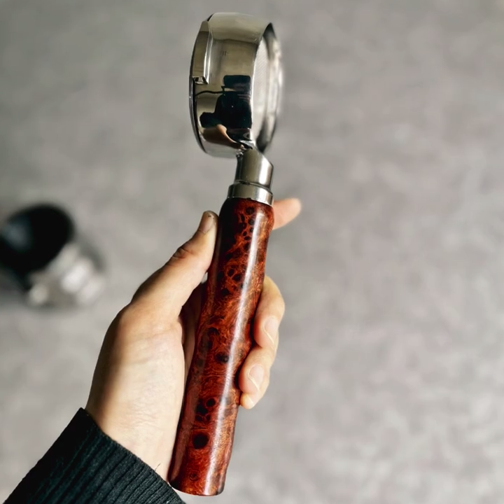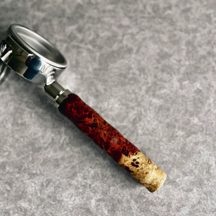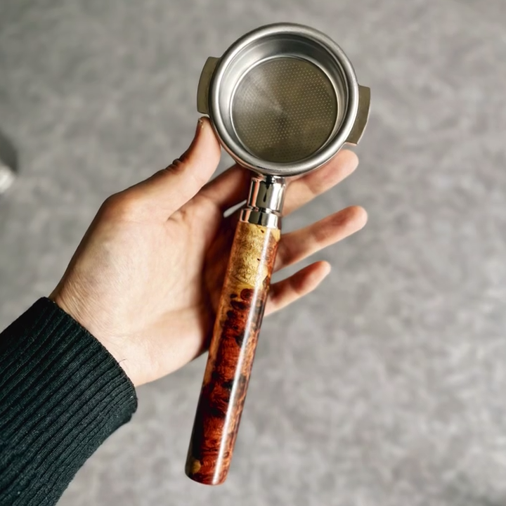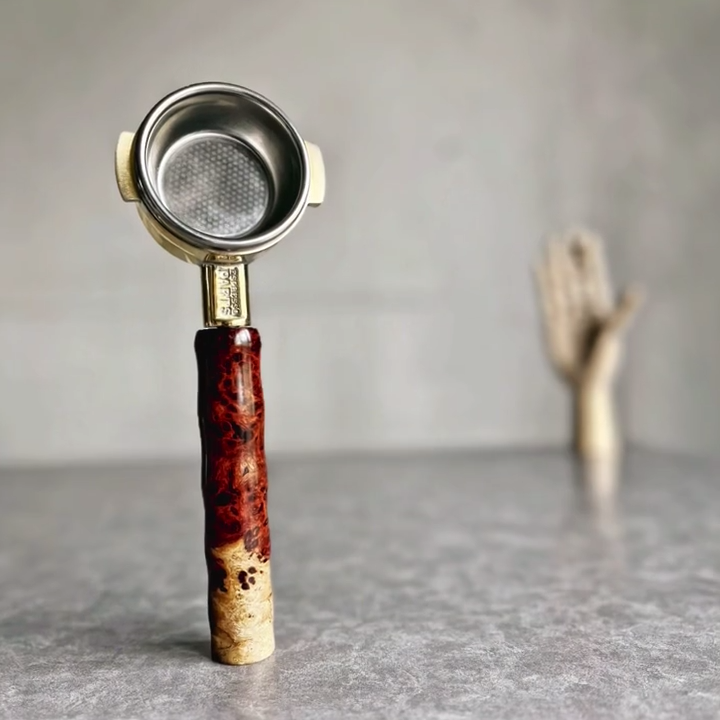 TimberFlare makes 1-of-1 aftermarket artisan bottomless portafilters for Breville machines, featuring this striking wood grain handle and a 304 stainless steel head.