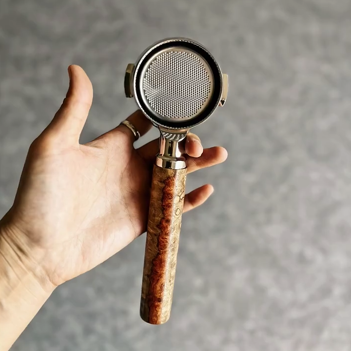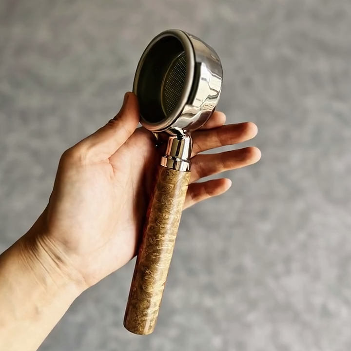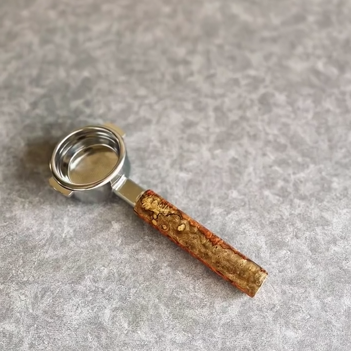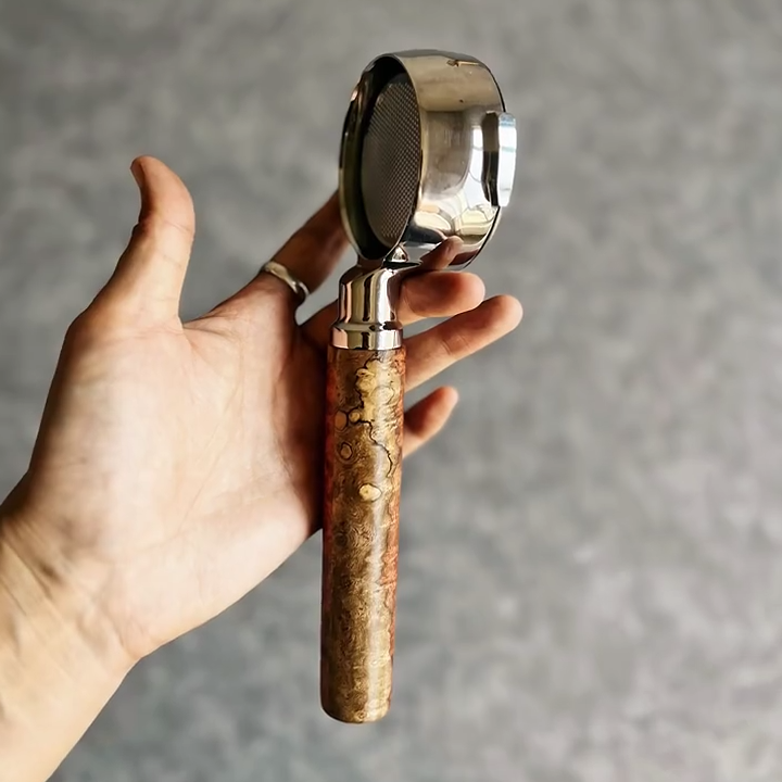 TimberFlare crafts 1-of-1 aftermarket artisan bottomless portafilters for Breville machines, featuring this striking Dual-Tone Burl wood handle and a polished 304 stainless steel head.