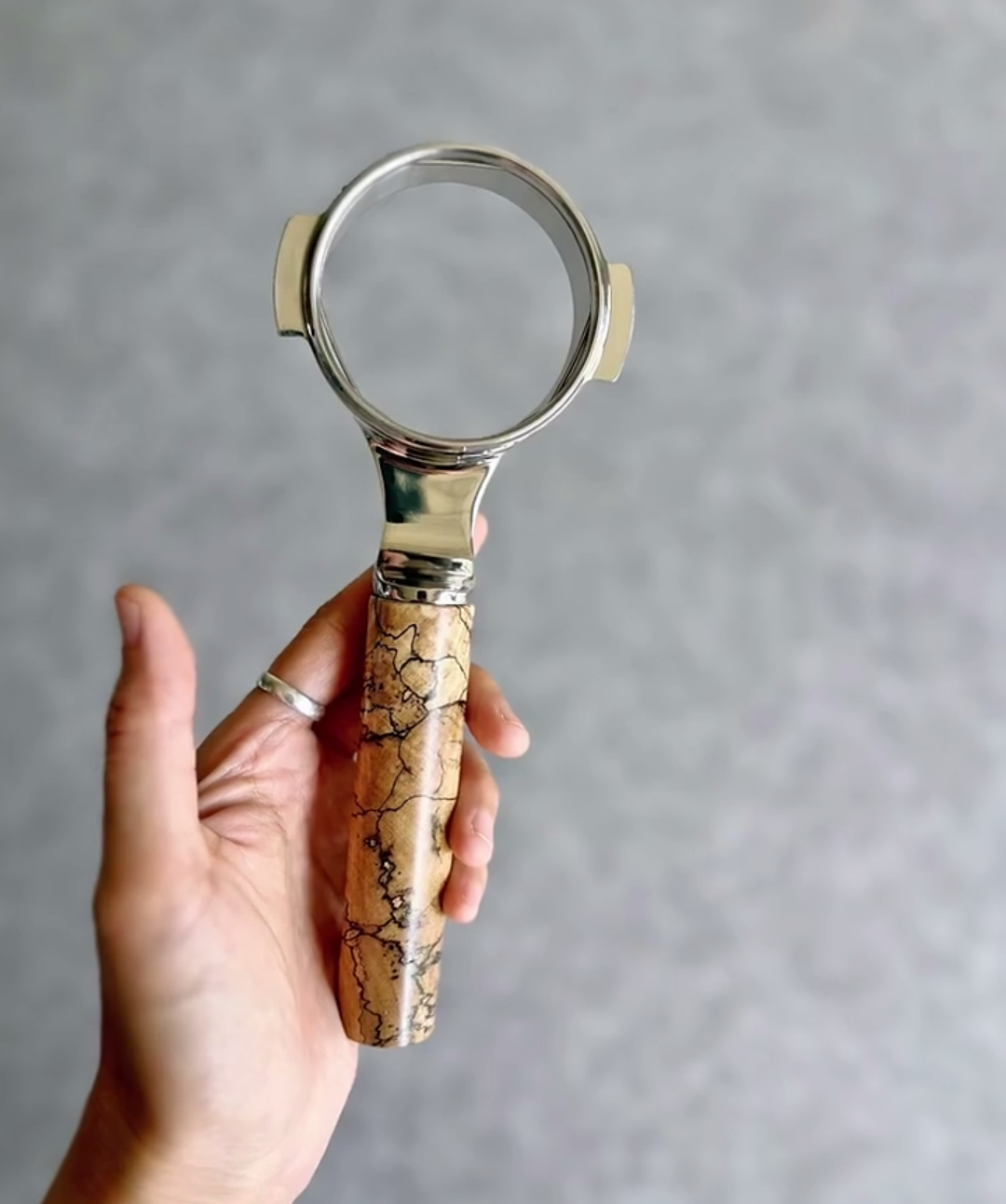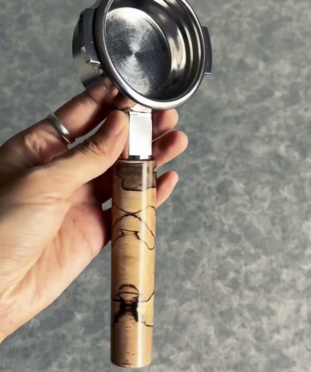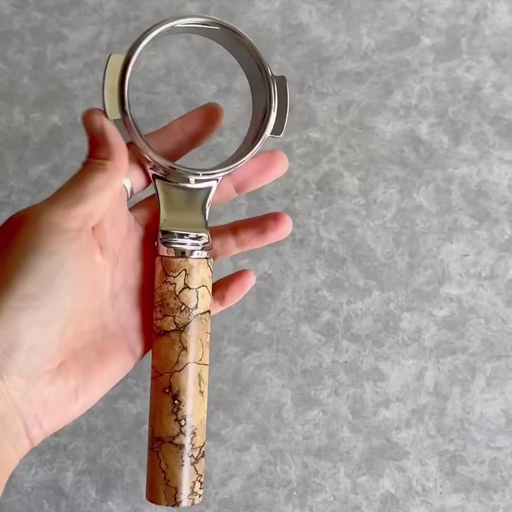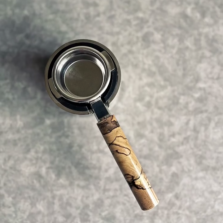 TimberFlare crafts 1-of-1 aftermarket artisan bottomless portafilters for Breville espresso machines, combining this intricate spalted wood handle with a 304 stainless steel head.