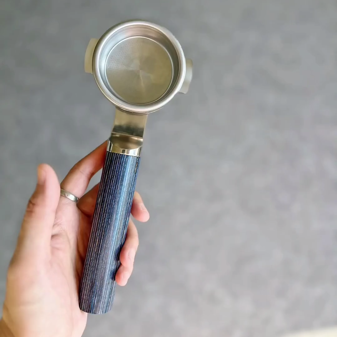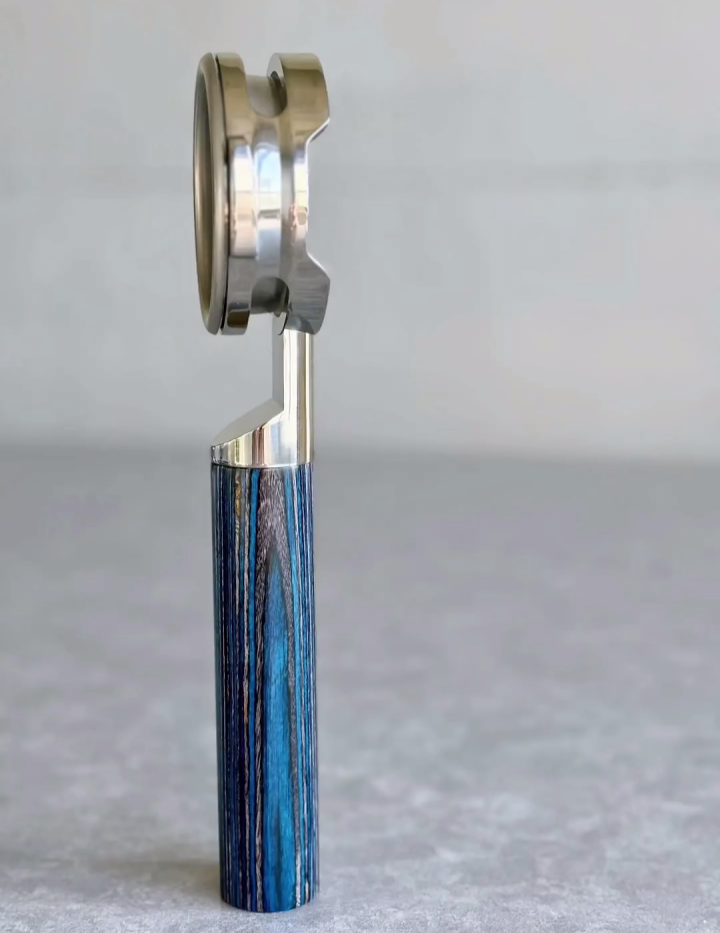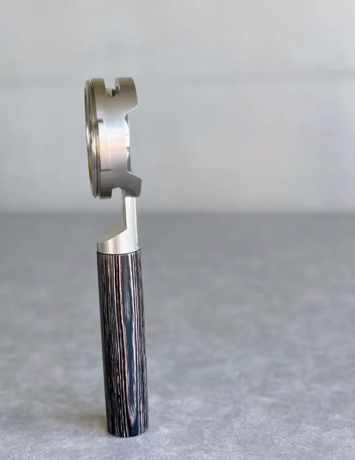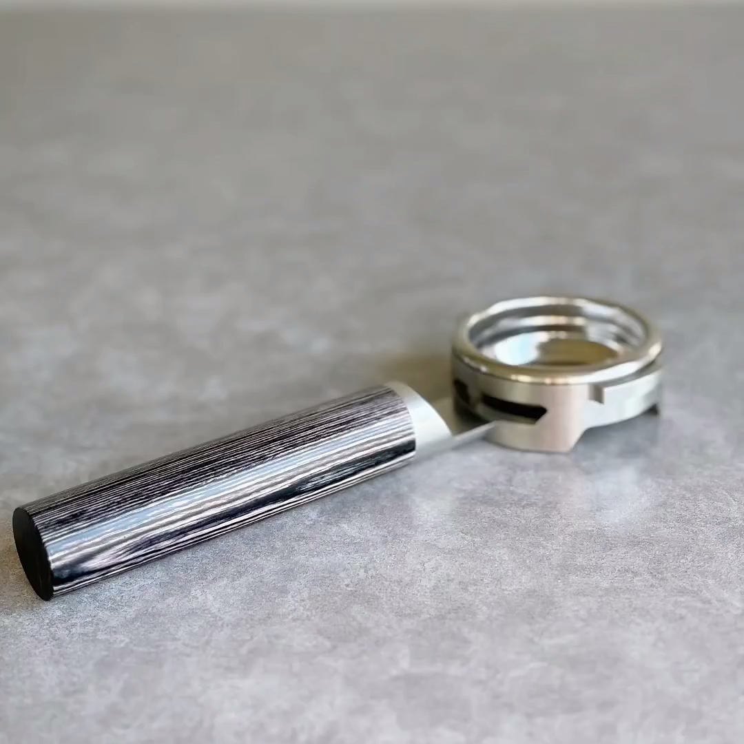 TimberFlare crafts 1-of-1 aftermarket artisan bottomless portafilters for Breville machines, featuring a Midnight Stripe finish handle and a 304 stainless steel head.