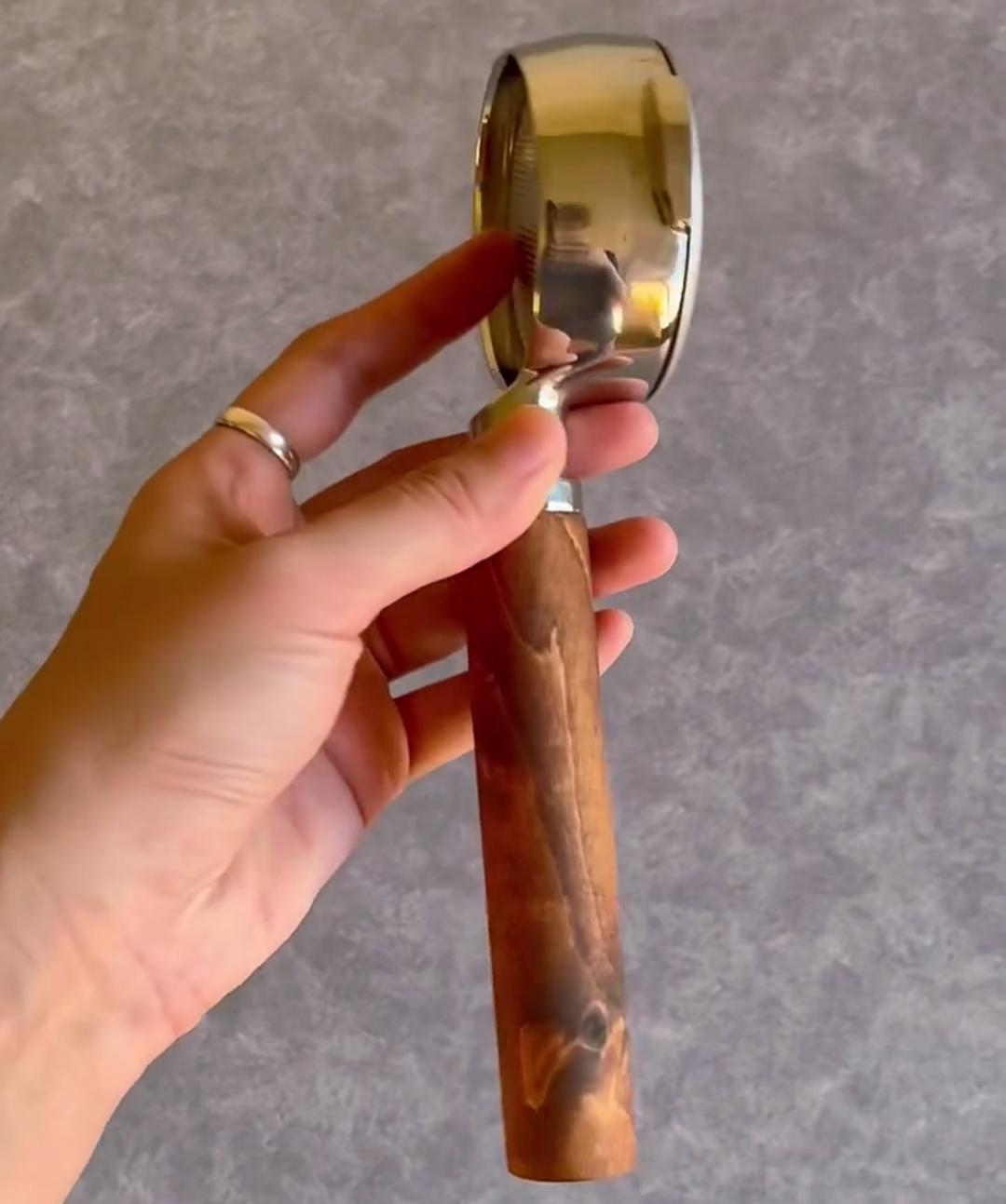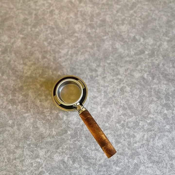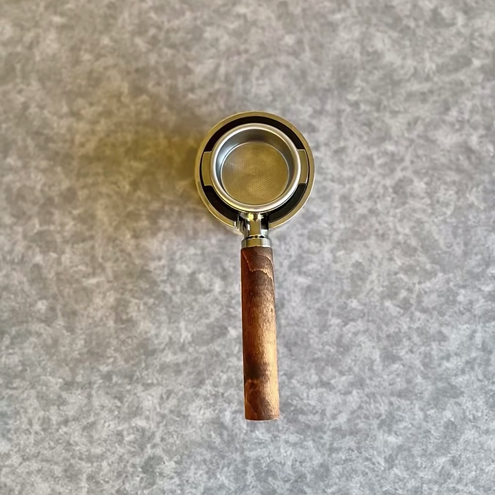 TimberFlare makes 1-of-1 aftermarket artisan bottomless portafilters for Breville machines, featuring a mineral-stained wood handle and a 304 stainless steel head.