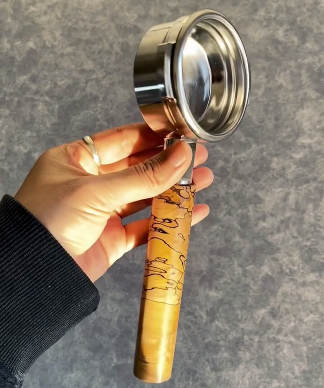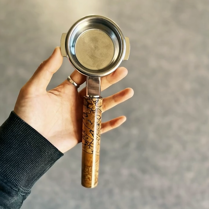 TimberFlare crafts 1-of-1 aftermarket artisan bottomless portafilters for Breville machines, featuring a Spalted Labyrinth finish and a 304 stainless steel head.