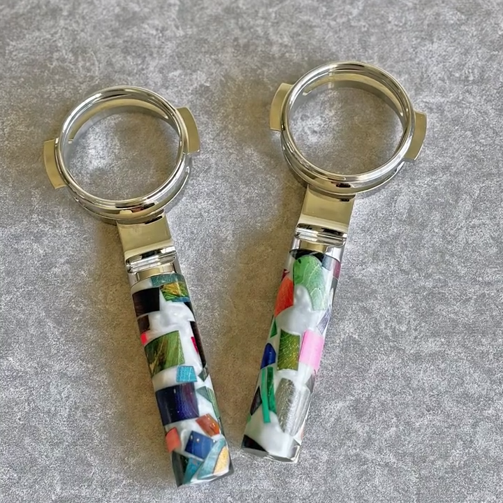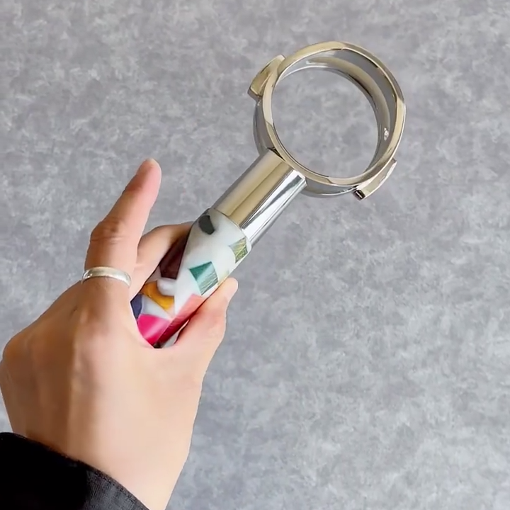 TimberFlare crafts 1-of-1 aftermarket artisan bottomless portafilters for Breville machines, featuring a colorful mosaic burl and resin handle integrated with a 304 stainless steel head.